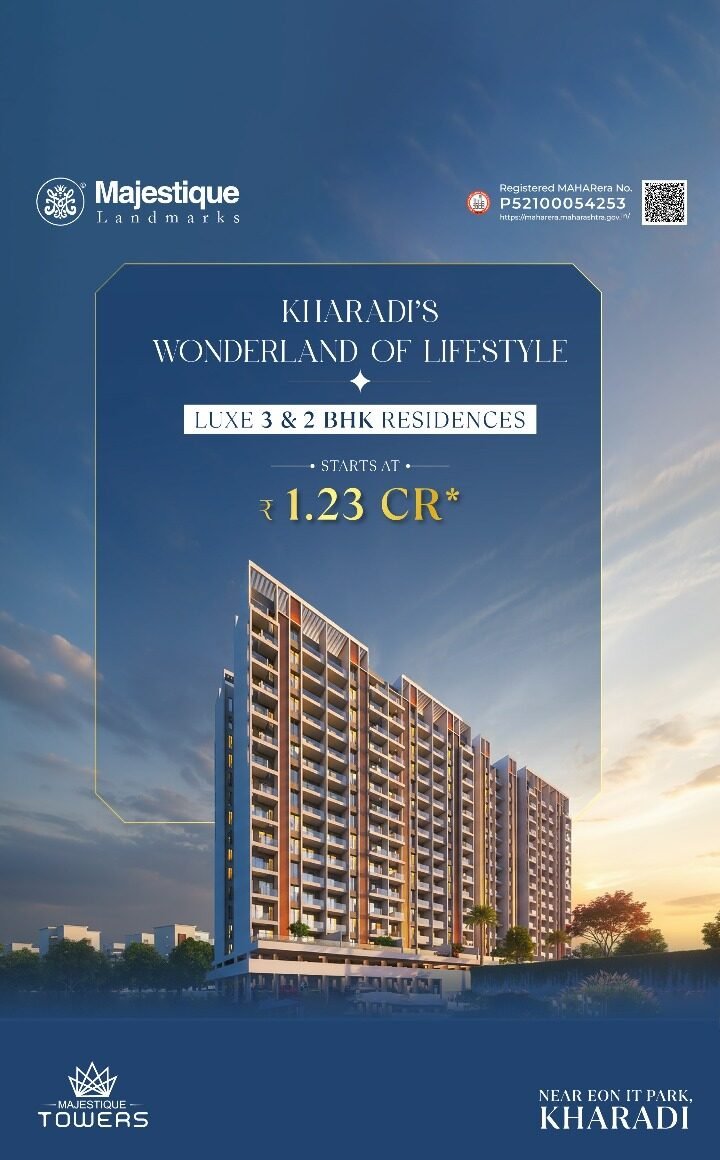 Live the wonder every day. Witness grandeur at its best. With so much room to make the most out of every moment, Majestique Towers is where sweet memories find their home. Thanks to sensibly planned layouts, ready-to-use amenities, best-in-class specs and a location so convenient, you remain close to everything you need at all times. Whether you’re looking for a 2 BHK in Kharadi or a spacious 3 BHK in Kharadi, Majestique Towers offers you the perfect blend of comfort, convenience, and elegance.